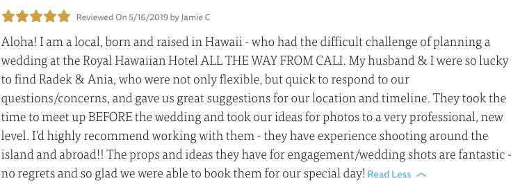 “Aloha! I am a local, born and raised in Hawaii – who had the difficult challenge of planning a wedding at the Royal Hawaiian Hotel ALL THE WAY FROM CALI. My husband & I were so lucky to find Radek & Ania, who were not only flexible, but quick to respond to our questions/concerns, and gave us great suggestions for our location and timeline. They took the time to meet up BEFORE the wedding and took our ideas for photos to a very professional, new level. I’d highly recommend working with them – they have experience shooting around the island and abroad!! The props and ideas they have for engagement/wedding shots are fantastic – no regrets and so glad we were able to book them for our special day!“
